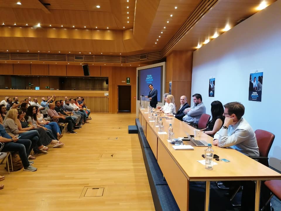 Σε ιδιαίτερα θερμό κλίμα πραγματοποιήθηκε η παρουσίαση του προγράμματος διακυβέρνησης της Νέας Δημοκρατίας στους εργαζόμενους του ομίλου ΟΤΕ στο Διοικητικό Μέγαρο σήμερα από κλιμάκιο υποψηφίων βουλευτών.