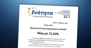 Αθήνα, 29 Ιουνίου 2022 ΔΕΛΤΙΟ ΤΥΠΟΥ Οι δυνάμεις της «ΕΝΟΤΗΤΑΣ» θριάμβευσαν στις εκλογές της ΕΥΔΑΠ. Ο Γραμματέας της «ΕΝΟΤΗΤΑΣ» Μανώλης Αγγελάκης θα εκπροσωπεί τους εργαζόμενους στο ΔΣ της ΕΥΔΑΠ Σπουδαία νίκη πέτυχαν οι δυνάμεις της «ΕΝΟΤΗΤΑΣ» στις εκλογές για την ανάδειξη εκπροσώπων των εργαζομένων στο Δ.Σ. της ΕΥΔΑΠ …