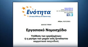 Αθήνα, 19/4/2021 ΔΕΛΤΙΟ ΤΥΠΟΥ Εργασιακό Νομοσχέδιο Υπόθεση των εργαζομένων; ή η μητέρα των μαχών ενός ξετσίπωτου κομματικού παιχνιδιού; Σε σύντομο χρονικό διάστημα θα κατατεθεί το εργασιακό νομοσχέδιο προς διαβούλευση με τους κοινωνικούς φορείς. Απέναντι σε όσα αποσπασματικά μέτρα παρουσιάζονται στα μέσα ενημέρωσης θα περίμενε κανείς ότι και η …