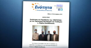 Αθήνα, 1 Οκτωβρίου 2021 ΔΕΛΤΙΟ ΤΥΠΟΥ Συνάντηση της «ΕΝΟΤΗΤΑΣ» με τον Εκπρόσωπο Τύπου της Νέας Δημοκρατίας κ. Τάσο Γαϊτάνη Την Πέμπτη 30 Σεπτεμβρίου 2021, το Προεδρείο της «ΕΝΟΤΗΤΑΣ» συναντήθηκε με τον εκπρόσωπο τύπου της Νέας Δημοκρατίας κ. Τάσο Γαϊτάνη. Στη συνάντηση αυτή οι εκπρόσωποί μας ανέπτυξαν τις θέσεις τους …