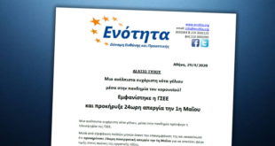 Αθήνα, 29/4/2020 ΔΕΛΤΙΟ ΤΥΠΟΥ Μια ανέλπιστα ευχάριστη νότα γέλιου μέσα στην πανδημία του κορονοϊού! Εμφανίστηκε η ΓΣΕΕ και προκήρυξε 24ωρη απεργία την 1η Μαΐου Μια ανέλπιστα ευχάριστη νότα γέλιου, μέσα στην πανδημία πρόσφερε η πλειοψηφία της ΓΣΕΕ. Μετά από εξαφάνιση πολλών μηνών έκανε την επανεμφάνιση της και ανακοίνωσε ότι …
