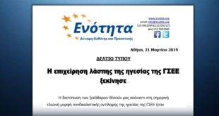 Αθήνα, 21 Μαρτίου 2019 ΔΕΛΤΙΟ ΤΥΠΟΥ Η επιχείρηση λάσπης της ηγεσίας της ΓΣΕΕ ξεκίνησε Η διατύπωση των ξεκάθαρων θέσεών μας απέναντι στη σημερινή ελεεινή μορφή συνδικαλιστικής αντίληψης της ηγεσίας της ΓΣΕΕ ήταν αναμενόμενο ότι θα δώσει το έναυσμα για ανήθικες επιθέσεις κατά στελεχών μας. Η πρώτη απόπειρα έγινε με …