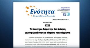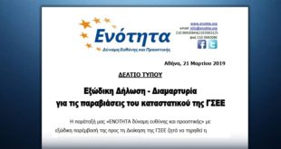 Αθήνα, 21 Μαρτίου 2019 ΔΕΛΤΙΟ ΤΥΠΟΥ Εξώδικη Δήλωση – Διαμαρτυρία για τις παραβιάσεις του καταστατικού της ΓΣΕΕ Η παράταξή μας «ΕΝΟΤΗΤΑ δύναμη ευθύνης και προοπτικής» με εξώδικη παρέμβασή της προς τη Διοίκηση της ΓΣΕΕ ζητά να τηρηθεί η νομιμότητα και το καταστατικό. Συνέδριο χωρίς την τήρηση του καταστατικού και …