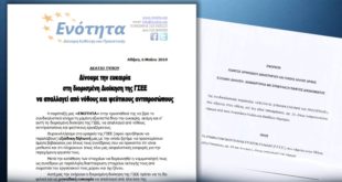 Αθήνα, 8 Απριλίου 2019 ΔΕΛΤΙΟ ΤΥΠΟΥ Η “ΕΝΟΤΗΤΑ” ΑΠΕΧΕΙ ΑΠΟ ΚΑΘΕ ΔΙΑΔΙΚΑΣΙΑ ΔΙΟΡΙΣΜΟΥ ΔΙΟΙΚΗΣΗΣ Καλούμε όλες τις παρατάξεις να απέχουν από διαδικασίες που οδηγούν στον αυτοεξευτελισμό τους ΜΟΝΗ ΛΥΣΗ Η ΠΡΟΤΑΣΗ ΤΗΣ “ΕΝΟΤΗΤΑΣ” Στις 12 Οκτωβρίου 2018 η παράταξη μας εξέδωσε δελτίο τύπου με τίτλο: «Η ΓΣΕΕ σε περιδίνηση». …