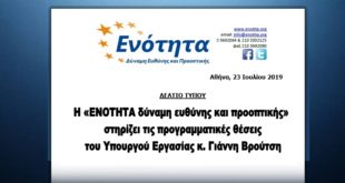 ΔιαβάστεΗ “ΕΝΟΤΗΤΑ δύναμη ευθύνης και προοπτικής” στηρίζει τις προγραμματικές θέσεις του Υπουργού Εργασίας κ. Γιάννη Βρούτση