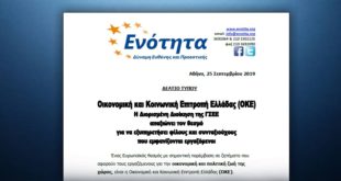 Αθήνα, 25 Σεπτεμβρίου 2019 ΔΕΛΤΙΟ ΤΥΠΟΥ Οικονομική και Κοινωνική Επιτροπή Ελλάδας (ΟΚΕ) Η Διορισμένη Διοίκηση της ΓΣΕΕ απαξιώνει τον θεσμό για να εξυπηρετήσει φίλους και συνταξιούχους που εμφανίζονται εργαζόμενοι Ένας Ευρωπαϊκός θεσμός με σημαντική παρέμβαση σε ζητήματα που αφορούν τους εργαζόμενους για την οικονομική και πολιτική ζωή της …