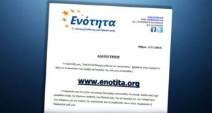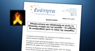Εθνική ενότητα και αλληλεγγύη σε αυτές τις δύσκολες στιγμές για την πατρίδα. Οι ευθύνες θα αναζητηθούν μετά το τέλος της τραγωδίας Αθήνα 24/7/2018 Τα ειλικρινή συλλυπητήρια στις οικογένειες των θυμάτων από την φονική πυρκαγιά εκφράζει η ΕΝΟΤΗΤΑ. Την ώρα που χώρα ολόκληρη δοκιμάζεται, ίσως να είναι πολυτέλεια να αναζητήσει κανείς …