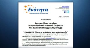Αθήνα, 18 Σεπτεμβρίου 2018 ΔΕΛΤΙΟ ΤΥΠΟΥ Μεγαλειώδης συγκέντρωση της συνδικαλιστικής μας παράταξης: “ΕΝΟΤΗΤΑ Δύναμη Ευθύνης και Προοπτικής” στη Θεσσαλονίκη Την Παρασκευή 14 Σεπτεμβρίου 2018, με αφορμή την παρουσία του Προέδρου της Νέας Δημοκρατίας κ. Κυριάκου Μητσοτάκη στη Διεθνή Έκθεση Θεσσαλονίκης, η παράταξή μας «ΕΝΟΤΗΤΑ Δύναμη Ευθύνης και Προοπτικής» σε …