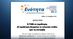 Αθήνα, 12 Οκτωβρίου 2018 ΔΕΛΤΙΟ ΤΥΠΟΥ Η ΓΣΕΕ σε περιδίνηση (Η περιδίνηση θεωρείται το τελευταίο στάδιο πριν τη συντριβή) Κάτω από το βάρος της απαξίωσης που αισθάνεται η ΓΣΕΕ από τους πραγματικούς εργαζόμενους και την πλήρη αδυναμία της για οποιαδήποτε παρέμβασή της που να δικαιολογεί το ρόλο και την …