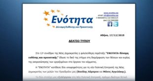 Αθήνα, 17 Δεκεμβρίου 2018 ΔΕΛΤΙΟ ΤΥΠΟΥ Στο 12ο συνέδριο της Νέας Δημοκρατίας η φιλελεύθερη παράταξη ’’ΕΝΟΤΗΤΑ-δύναμη ευθύνης και προοπτικής’’ έδωσε το δικό της στίγμα στη διαμόρφωση των θέσεων και κυρίως της εκπροσώπησης των εργαζομένων στα όργανα του κόμματος. Η ’’ΕΝΟΤΗΤΑ’’ κατέθεσε δύο υποψηφιότητες για τη νέα Πολιτική Επιτροπή της …