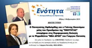 Αθήνα, 4 Φεβρουαρίου 2019 ΔΕΛΤΙΟ ΤΥΠΟΥ Ο Παναγιώτης Οφθαλμίδης και ο Γιάννης Οικονόμου μέλη του Προεδρείου της “ΕΝΟΤΗΤΑΣ” υποψήφιοι στις Περιφερειακές Εκλογές με το Ψηφοδέλτιο “ΝΕΑ ΑΡΧΗ” του Γιώργου Πατούλη Δύο μέλη του Προεδρείου της «ΕΝΟΤΗΤΑΣ» διεκδικούν την ψήφο και τη στήριξή μας στις προσεχείς εκλογές της Περιφέρειας Αττικής με …
