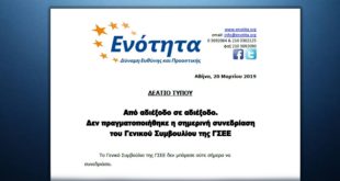 Αθήνα, 18 Μαρτίου 2019 ΔΕΛΤΙΟ ΤΥΠΟΥ ΓΣΕΕ ηλικία: 100 ετών (1919 – 2019) Απεβίωσε πλήρης ημερών Πριν δύο χρόνια η παράταξή μας «ΕΝΟΤΗΤΑ δύναμη ευθύνης και προοπτικής» στην ιδρυτική της διακήρυξη ξεκαθάρισε τον σκοπό και τις αρχές λειτουργίας μας: «Στόχος μας είναι η δημιουργία μας σύγχρονης, ελεύθερης ευρωπαϊκής δομής …