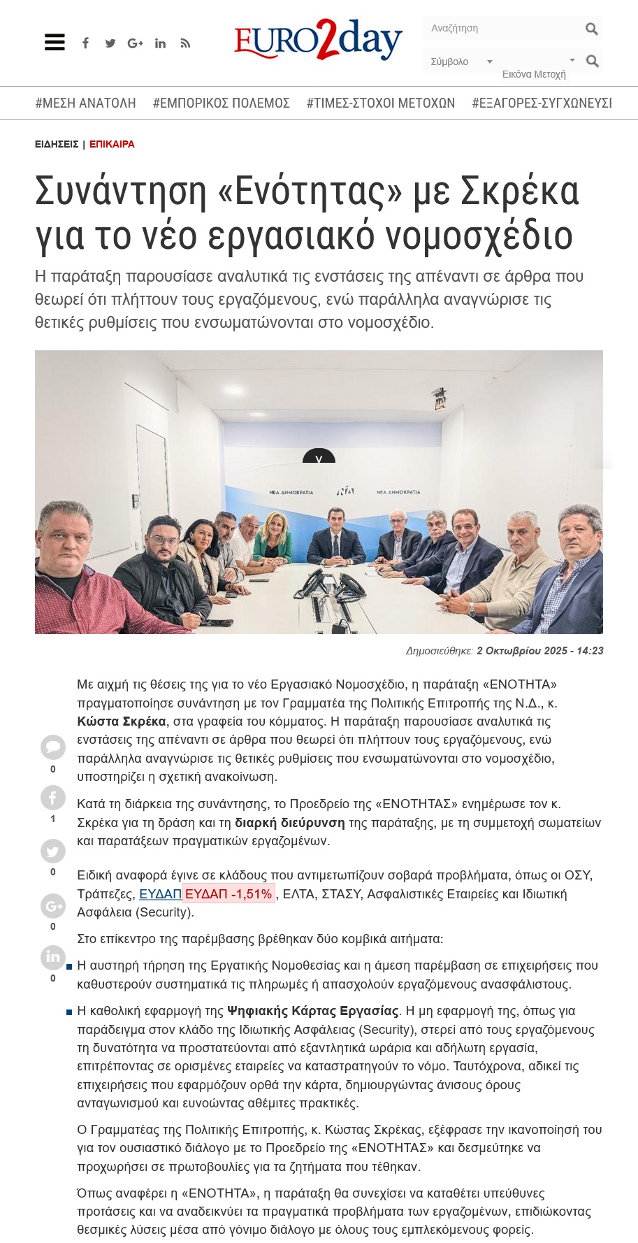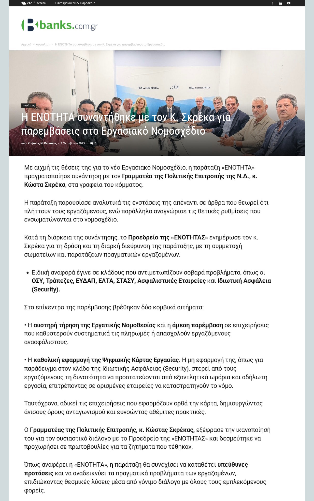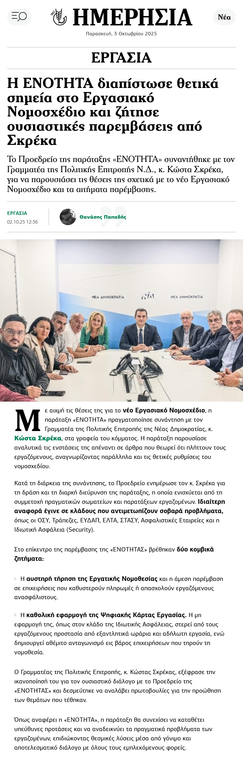 Δημοσιεύματα: Συνάντηση του Προεδρείου της «ΕΝΟΤΗΤΑΣ» με τον Γραμματέα της Πολιτικής Επιτροπής της Νέας Δημοκρατίας κ. ΚΩΣΤΑ ΣΚΡΕΚΑ October 3, 2025 Share Facebook Twitter LinkedIn