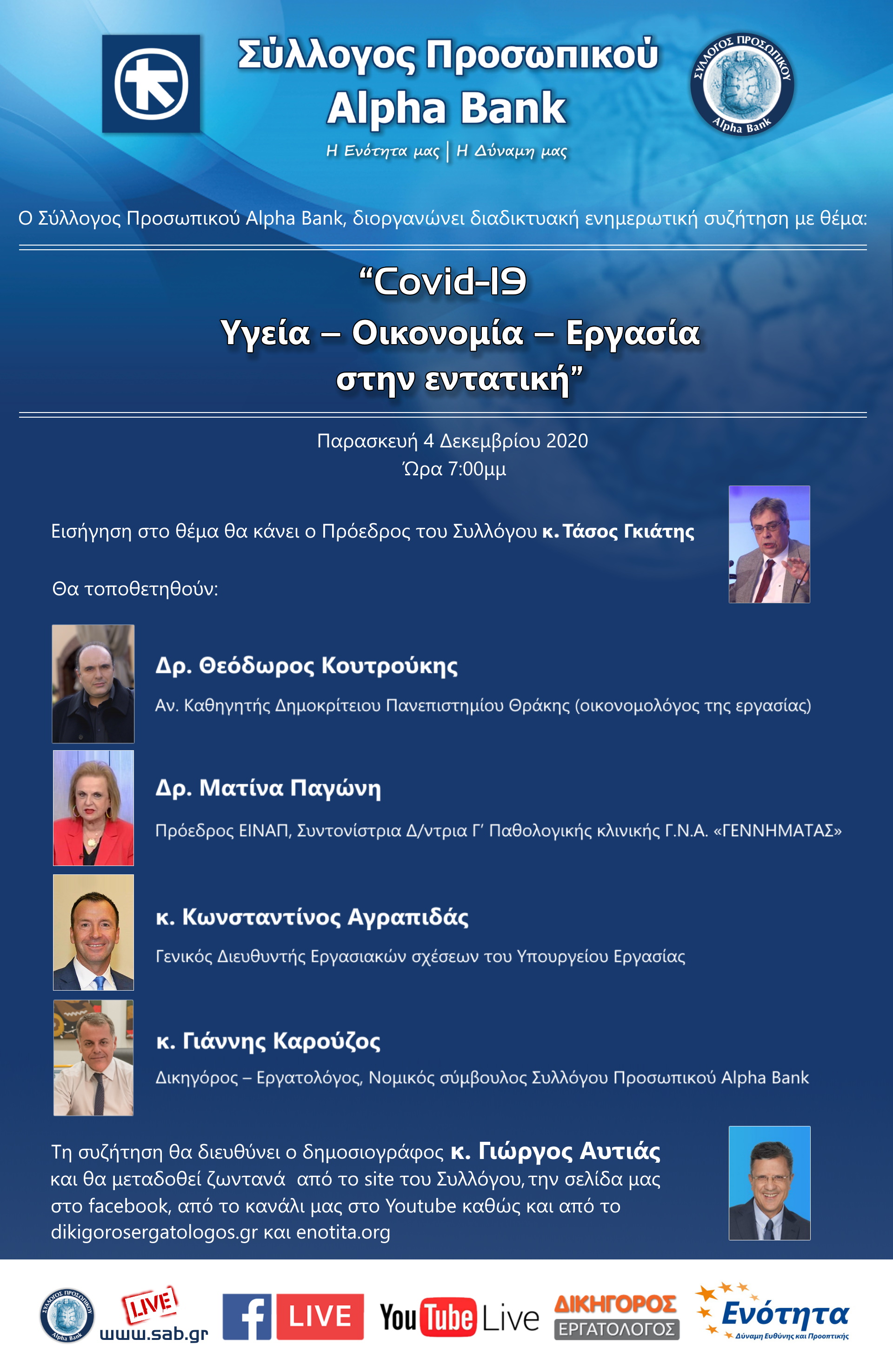 Ο Σύλλογος Προσωπικού Alpha Bank και η Ενότητα, διοργανώνουν διαδικτυακή ενημερωτική συζήτηση με θέμα: