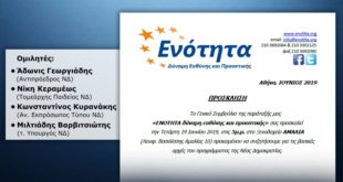 Αθήνα, ΙΟΥΝΙΟΣ 2019 ΠΡΟΣΚΛΗΣΗ Το Γενικό Συμβούλιο της παράταξής μας «ΕΝΟΤΗΤΑ δύναμη ευθύνης και προοπτικής» σας προσκαλεί την Τετάρτη 19 Ιουνίου 2019, στις 5μ.μ. στο Ξενοδοχείο ΑΜΑΛΙΑ (Λεωφ. Βασιλίσσης Αμαλίας 10) προκειμένου να συζητήσουμε για τις βασικές αρχές του προγράμματος της Νέας Δημοκρατίας. Ομιλητές: Άδωνις Γεωργιάδης (Αντιπρόεδρος …