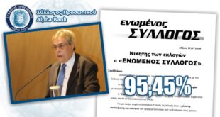 Συντριπτική νίκη για την συνδικαλιστική παράταξη “ΕΝΩΜΕΝΟΣ ΣΥΛΛΟΓΟΣ” στις εκλογές του Συλλόγου Προσωπικού στην Alpha Bank. Ο Ενωμένος Σύλλογος έλαβε ποσοστό 95,45%.
