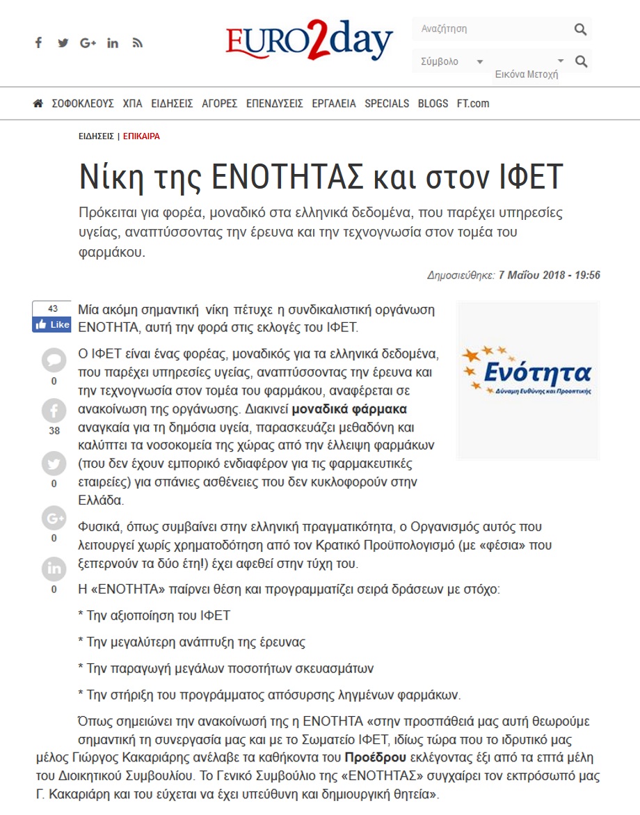 Μία ακόμη σημαντική νίκη πέτυχε η συνδικαλιστική οργάνωση ΕΝΟΤΗΤΑ, αυτή την φορά στις εκλογές του ΙΦΕΤ.