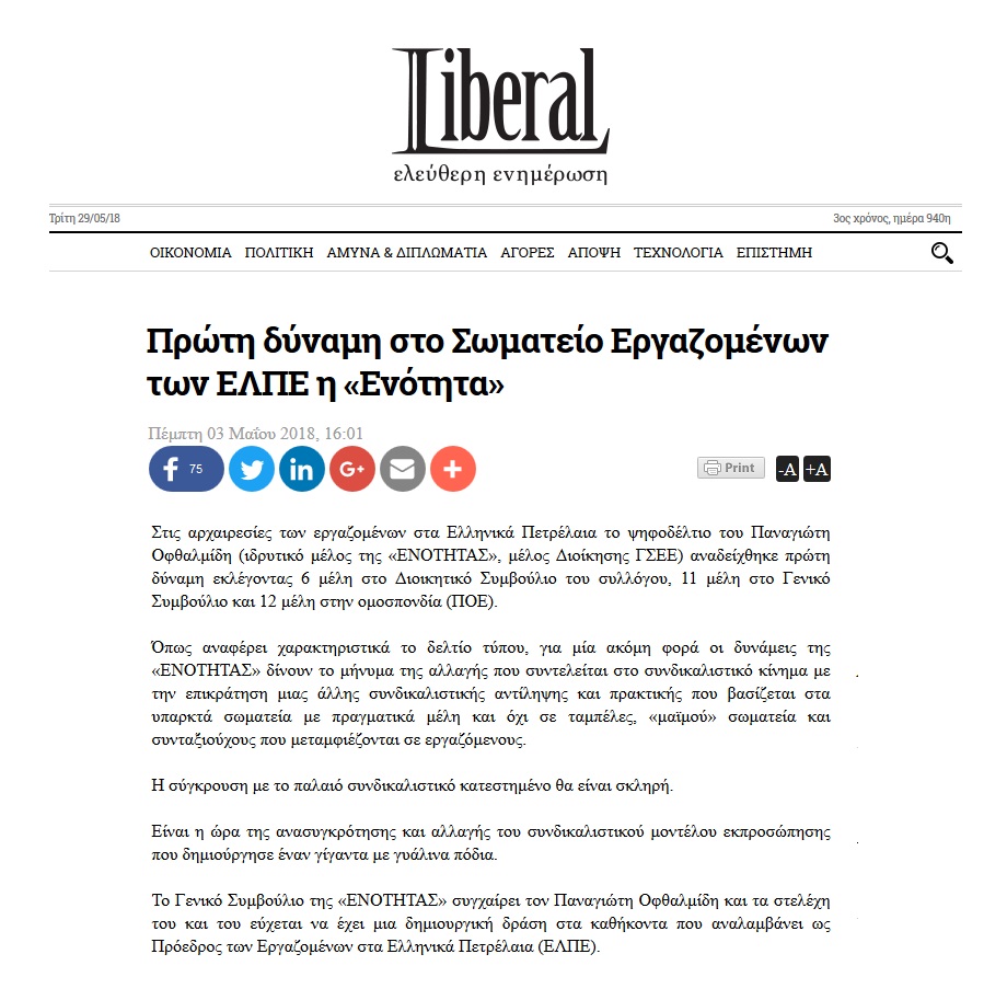 Liberal: Πρώτη δύναμη στο Σωματείο Εργαζομένων των ΕΛΠΕ η ΕΝΟΤΗΤΑ May 3, 2018 Για μία ακόμη φορά οι δυνάμεις της ΕΝΟΤΗΤΑΣ δίνουν το μήνυμα της αλλαγής. Share Facebook Twitter LinkedIn